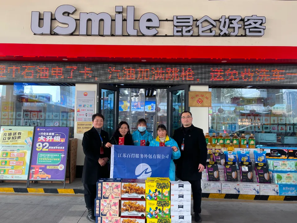 2024年即将来临之际,江苏百得服务外包有限公司开展冬日送温暖活动。公司总经理携各部门负责人兵分多路前往中国石油天然气股份有限公司江苏销售分公司加油站,给坚守在一线的加油站外包员工送去了新年的祝福、节日的问候以及关怀。