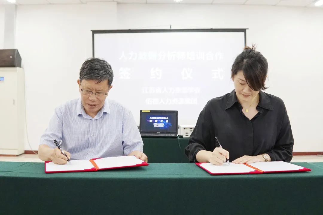 佰德集团与江苏省人力资源学会举行了“人力资源数据分析师”认证培训战略合作签约仪式,江苏省人力资源学会理事长刘洪与佰德集团总经理何冬云共同签署了合作协议。